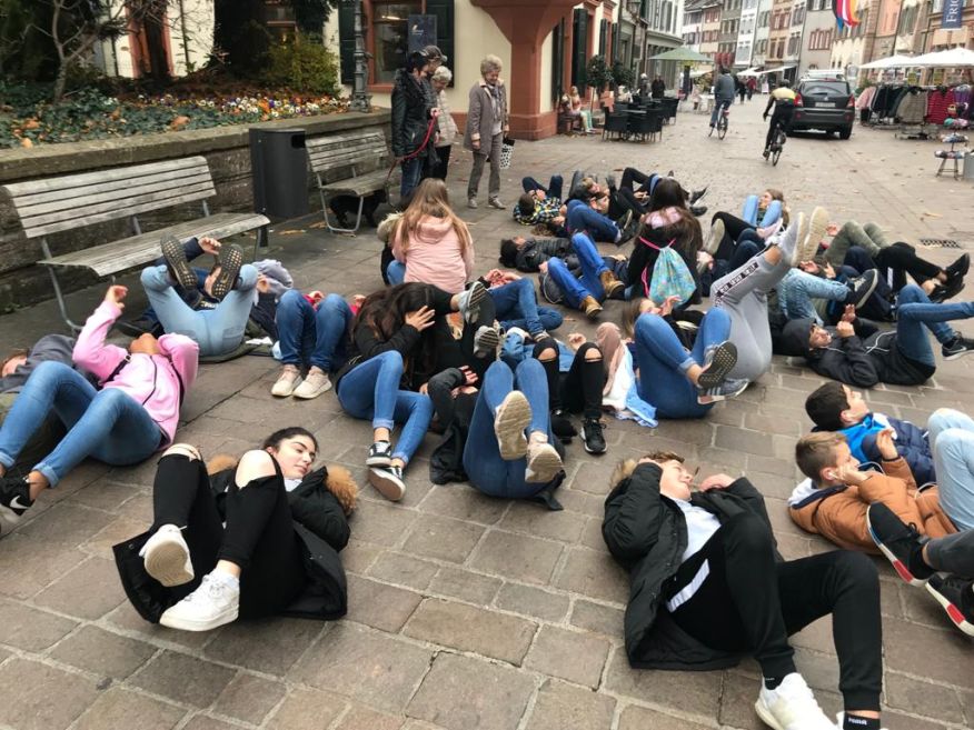 Am Donnerstagnachmittag, 15. 11. 2018, war eine skurril anmutende Gruppe von cirka 40 Oberstufenschüler/innen auf öffentlichen Plätzen in Rheinfelden anzutreffen. Unter der professionellen Anleitung von Christina Kuntner, Kulturschaffender des Kantons Aargau (remote citizen christian kuntner), interagierte diese Schülergruppe mit spontanen Kurzaktionen: anmutig, irritierend, amüsant. Am Bahnhof, bei der Sprengung vom Furnierwerkturm, in der Marktgasse oder im Migros – überall war diese seltsame Gruppe anzutreffen. Die Passanten zeigten sich erstaunt und interessiert, reagierten mit viel Witz auf Aktionen und wollten wissen, was diese Jugendlichen da eigentlich machen: „Sammeln die Geld? Wer leitet diese Gruppe an? Was ist das? Schau mal, dort ist derjenige, der ihnen per Knopf im Ohr Anweisungen gibt!“