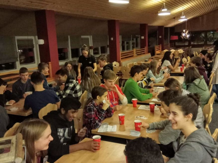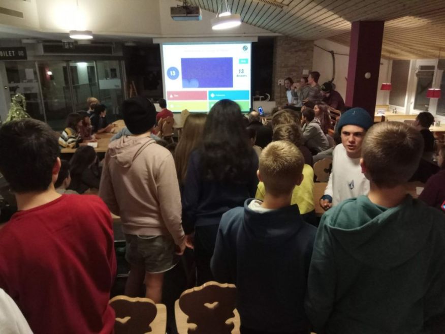 Nach dem Abendessen startete das erste der fünf Abendprogramme, welches von den Leitern mit viel Aufwand vorbereitet worden war. In den Skigruppen mussten die Schülerinnen und Schüler per Handy ein witziges Quiz über die Leiter bestreiten. Eine amüsante Angelegenheit und manch einer hätte sich noch mehr als 52 Fragen über die aus den Vorjahren bereits bekannten und teilweise unbekannten Leiter gewünscht. Um 22:00 Uhr war dann allerdings Nachtruhe.