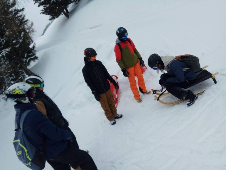 Am Freitag ging es nach dem Packen zur letzten Aktivität. Jeweils zu zweit machten wir uns mit einem Schlitten auf den Weg ins Tal hinunter. Auf einer tollen Fahrt konnten wir noch einmal die Winterlandschaft und uns gegenseitig geniessen.