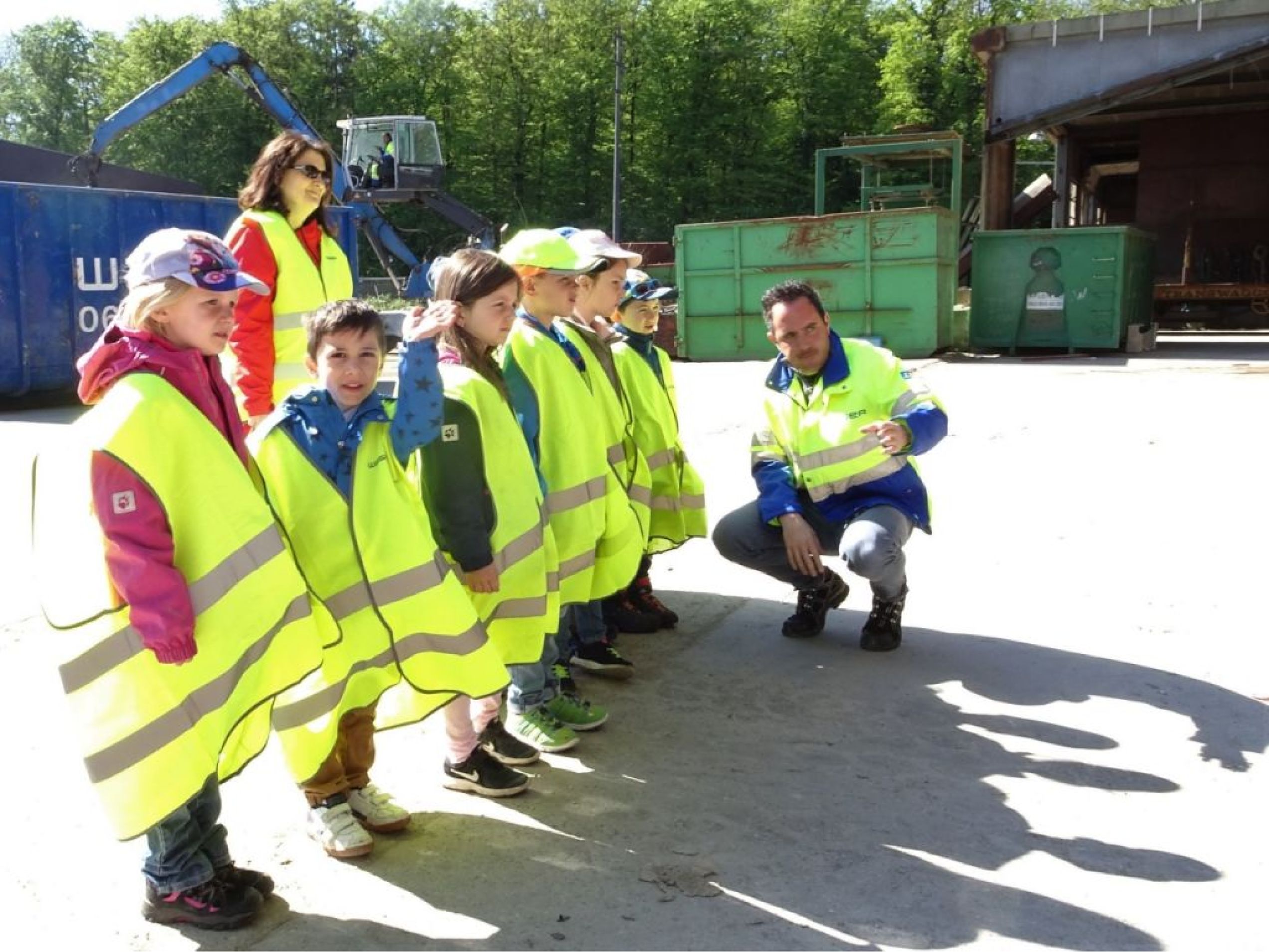 Zu Fuss starteten wir im Kindergarten Spielplatz und machten uns freudig und voller Neugierde auf den Weg durch die Quartiere, über Felder, an den Salinen vorbei, Richtung Rheinfelden. Philippe Moser von der Entsorgungsstelle erwartete uns bereits. Wir erhielten eine kurze Einführung, was die Aufgaben einer Entsorgungsstelle sind und die Kinder stellten viele Fragen. Schliesslich erhielten alle eine Leuchtweste, in denen sie regelrecht verschwanden, was ziemlich lustig war. Wir waren tatsächlich unübersehbar! Dann ging es endlich los. Voller Faszination beobachteten wir die verschiedenen Maschinen, mit denen Metall zerkleinert, Abfall sortiert, umgeladen und bearbeitet wurde. Wir lernten, was wie entsorgt werden muss, damit möglichst viel wieder recycelt werden kann. Wir erfuhren, dass Papiertüten eigentlich zum Karton gezählt werden und vieles mehr… Am Schluss durften die Kinder sich auf die grosse Waage stellen und brachten 330 kg zusammen, was einer Entsorgungsgebühr von 99.- Fr. entspricht:-). Schliesslich war der Hunger gross und wir grillierten an einer nahegelegenen Feuerstelle. Der Rückmarsch war dann etwas anstrengend, da die meisten Beine und Füsse schon recht müde waren. Es war ein ausgesprochen spannender und lehrreicher Ausflug! Danke an Philippe Moser und die Firma Waser für Ihre Grosszügigkeit und Gastfreundschaft!