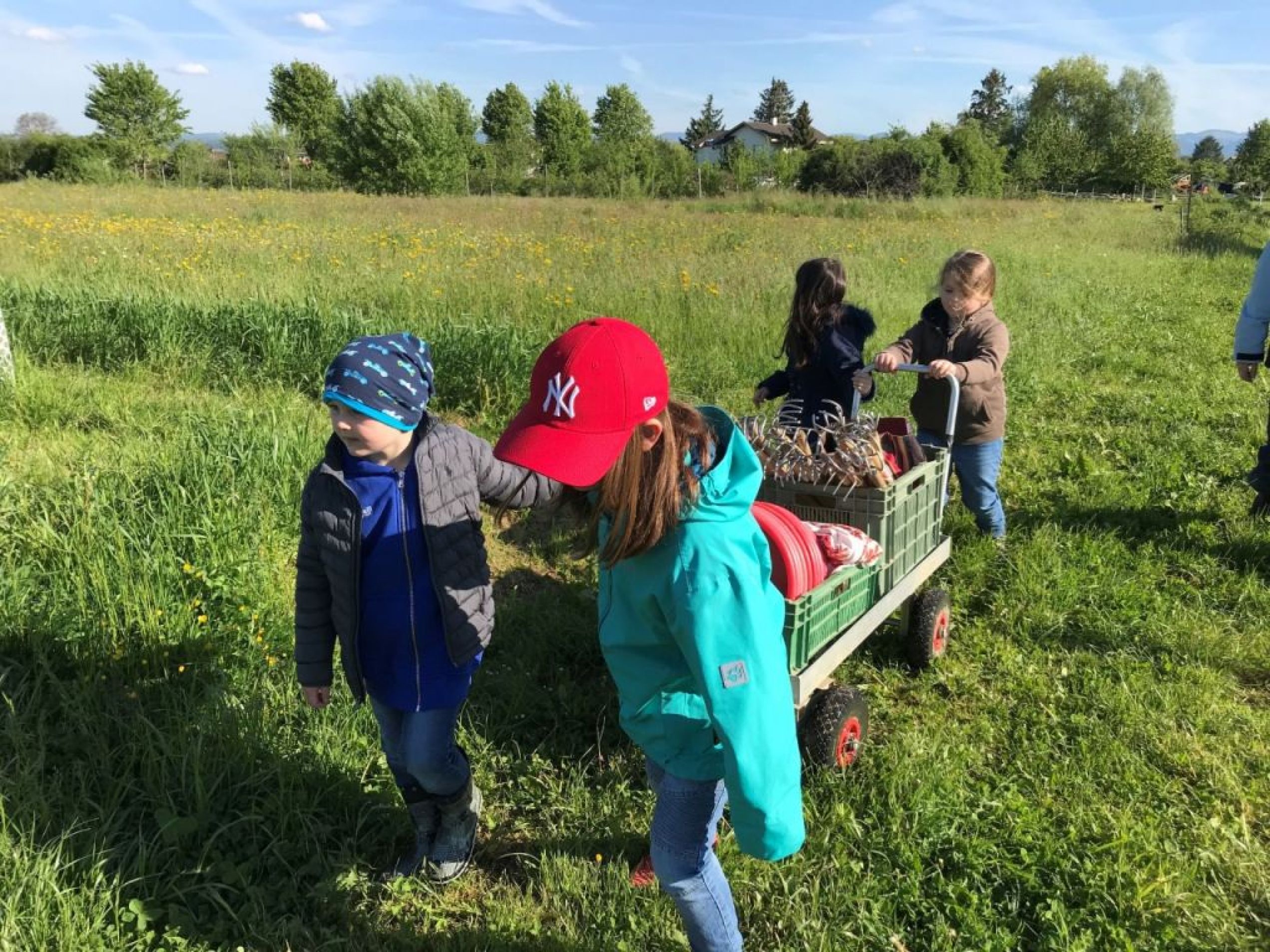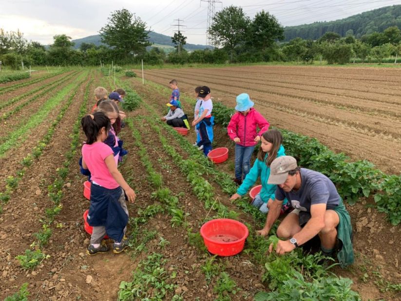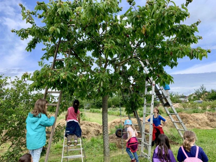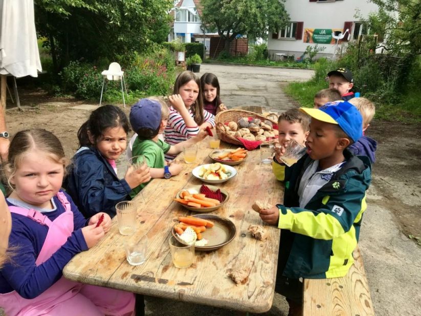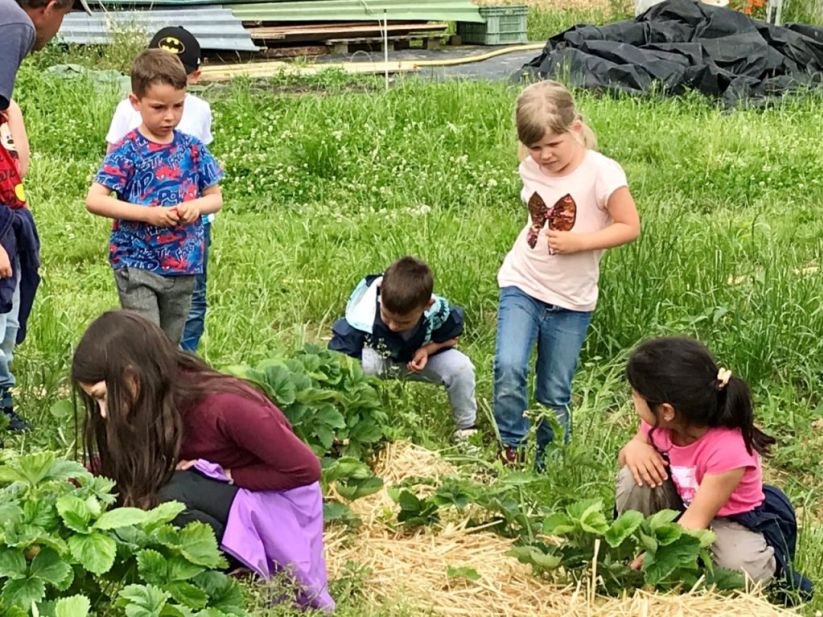 Als wir beim Beet unsere Arbeit geleistet hatten, ging es zu den Kirschbäumen, als „Apero“ durften die Kinder auf die Bäume klettern und Kirschen pflücken und essen. Danach gab es das Bauernznüni mit Most, Brötchen, Karotten, Randen, Apfelschnitzen und Kohlrabi. Nach einer kurzen Spielpause ging es danach wieder auf das Feld, um unser Dessert „Erdbeeren“ zu pflücken und zu essen.