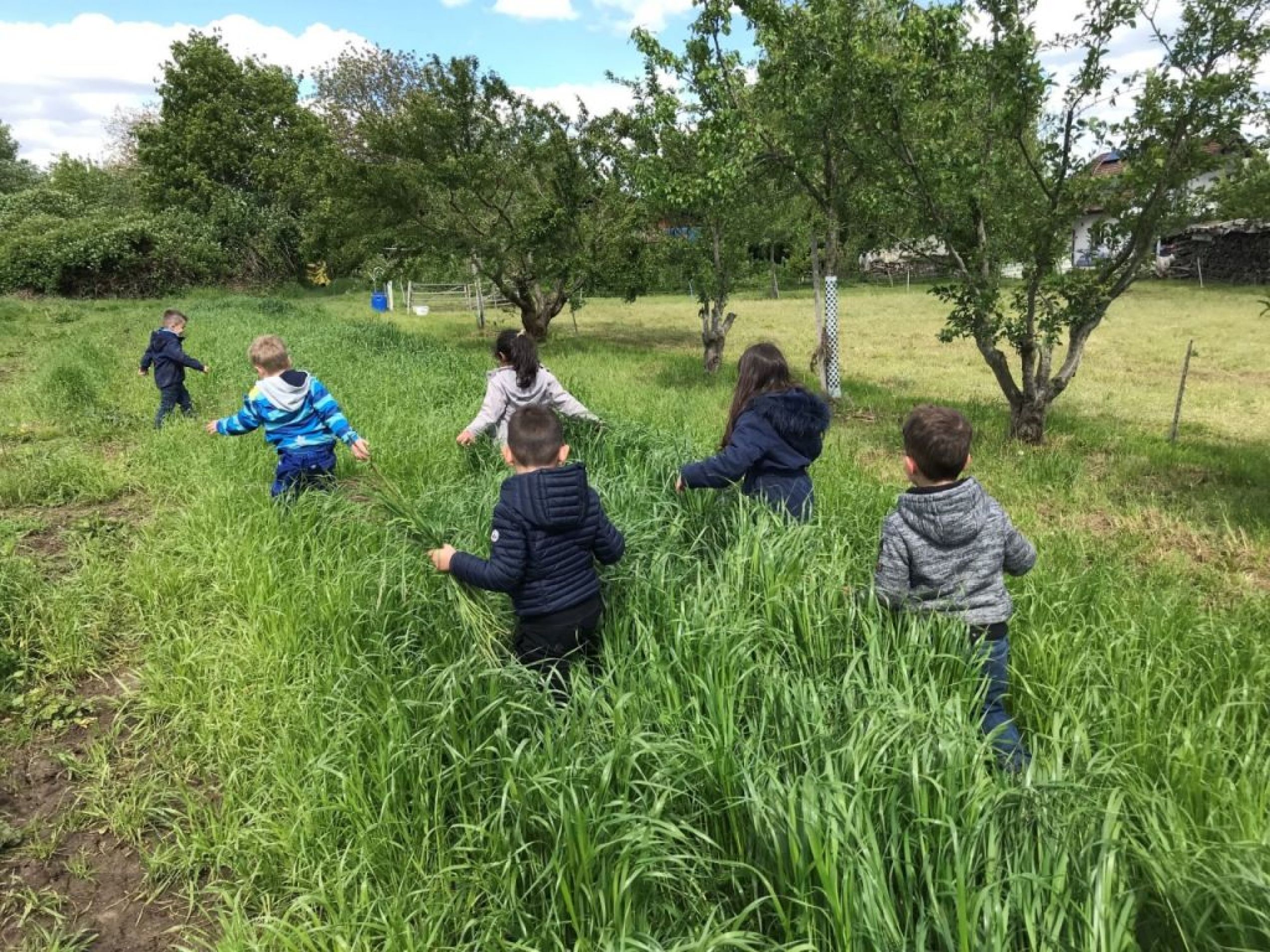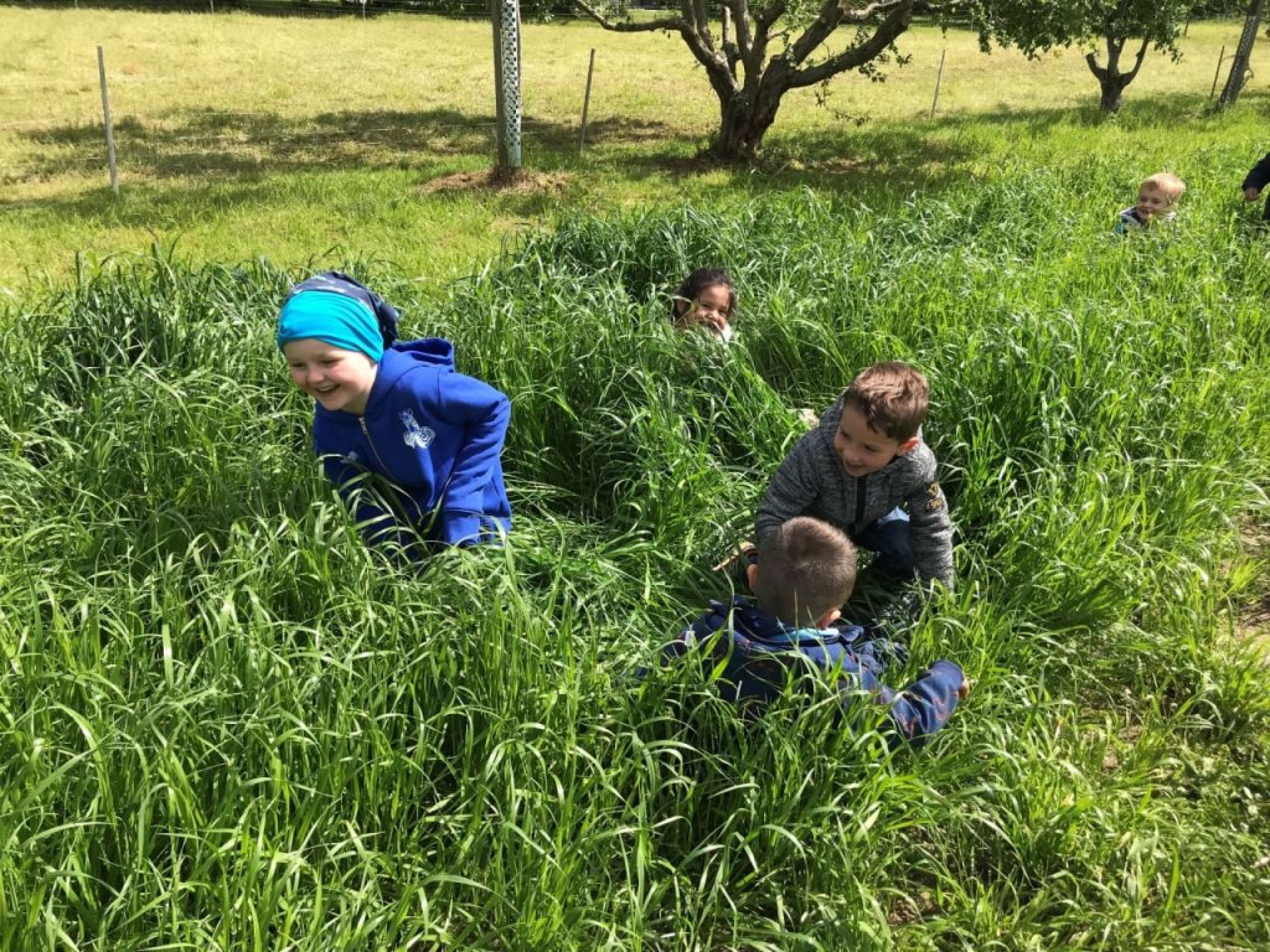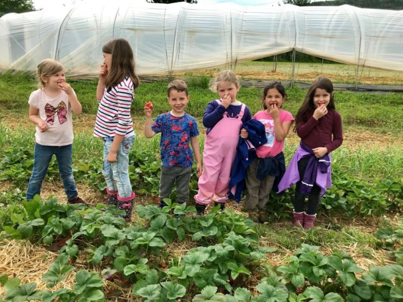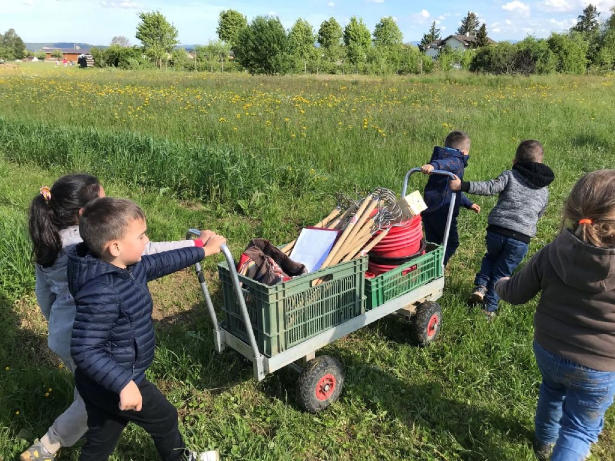 Als wir beim Beet unsere Arbeit geleistet hatten, ging es zu den Kirschbäumen, als „Apero“ durften die Kinder auf die Bäume klettern und Kirschen pflücken und essen. Danach gab es das Bauernznüni mit Most, Brötchen, Karotten, Randen, Apfelschnitzen und Kohlrabi. Nach einer kurzen Spielpause ging es danach wieder auf das Feld, um unser Dessert „Erdbeeren“ zu pflücken und zu essen.
